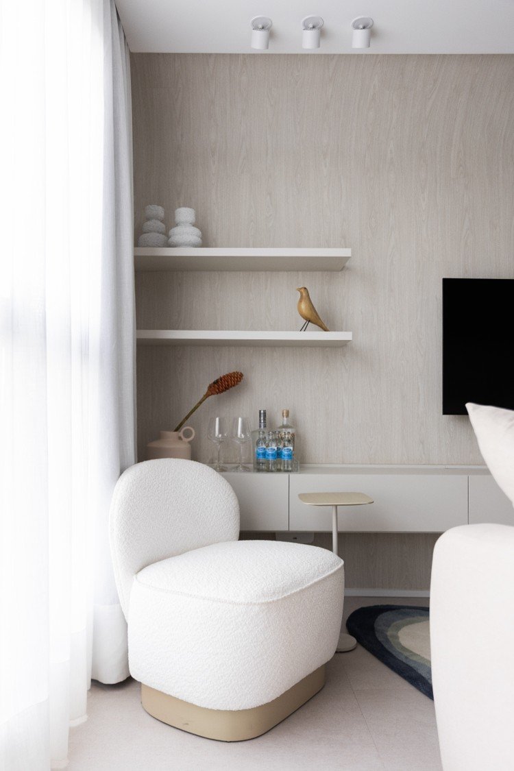 O apto sea é inspirado pelo mar, elemento essencial na vida do cliente, foi aí que trouxemos um conceito que traduz sua conexão com a imensidão azul. O ambiente foi pensado para ser leve, fluído e atemporal, remetendo às ondas, ao azul do céu e à serenidade da brisa marítima.