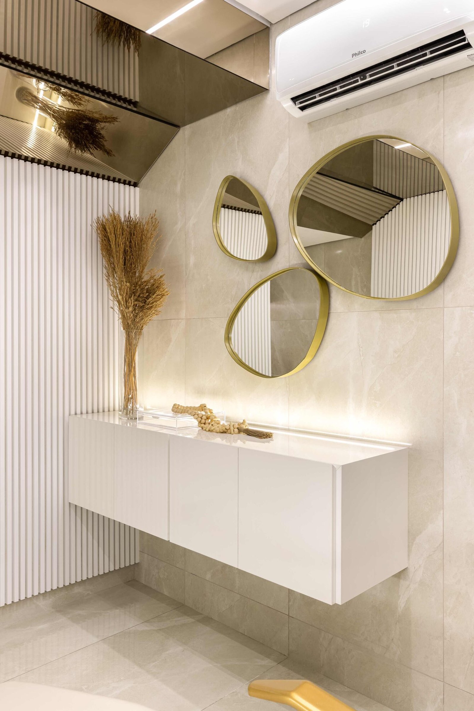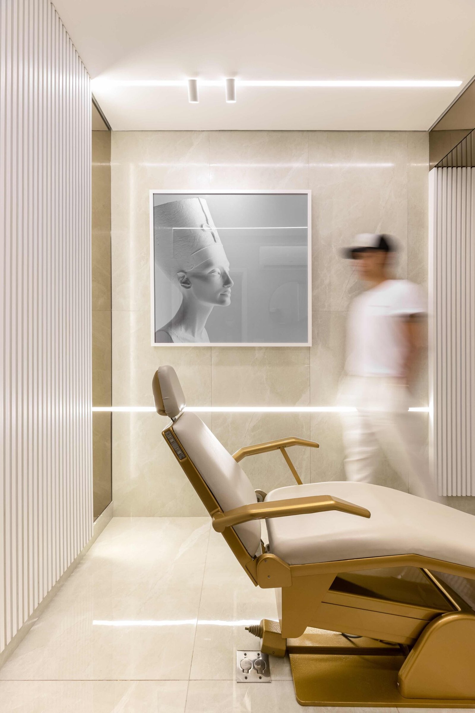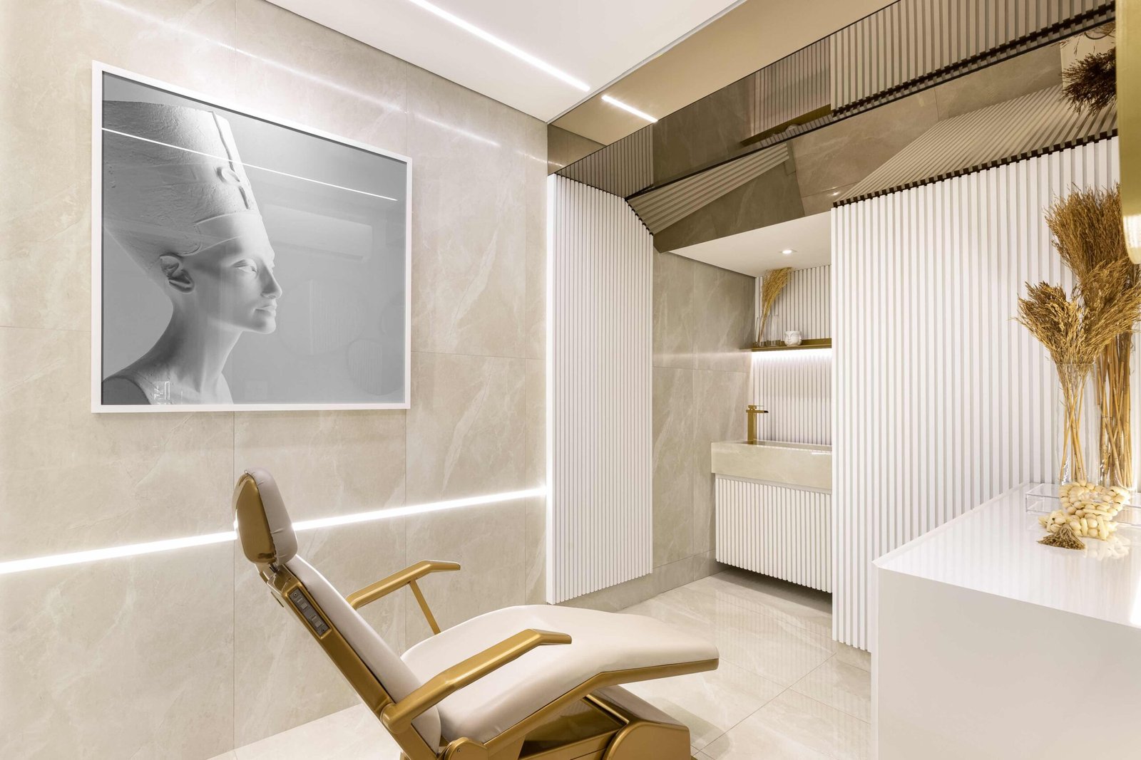 O projeto de interiores da Clínica de Estética FF foi pensado para criar um ambiente de relaxamento e sofisticação, ideal para promover o bem-estar dos clientes. Utilizando apenas duas cores bases, o branco e o dourado, o espaço reflete um equilíbrio perfeito entre serenidade e requinte. O branco, símbolo de pureza e tranquilidade, amplia os espaços e contribui para uma sensação de leveza.