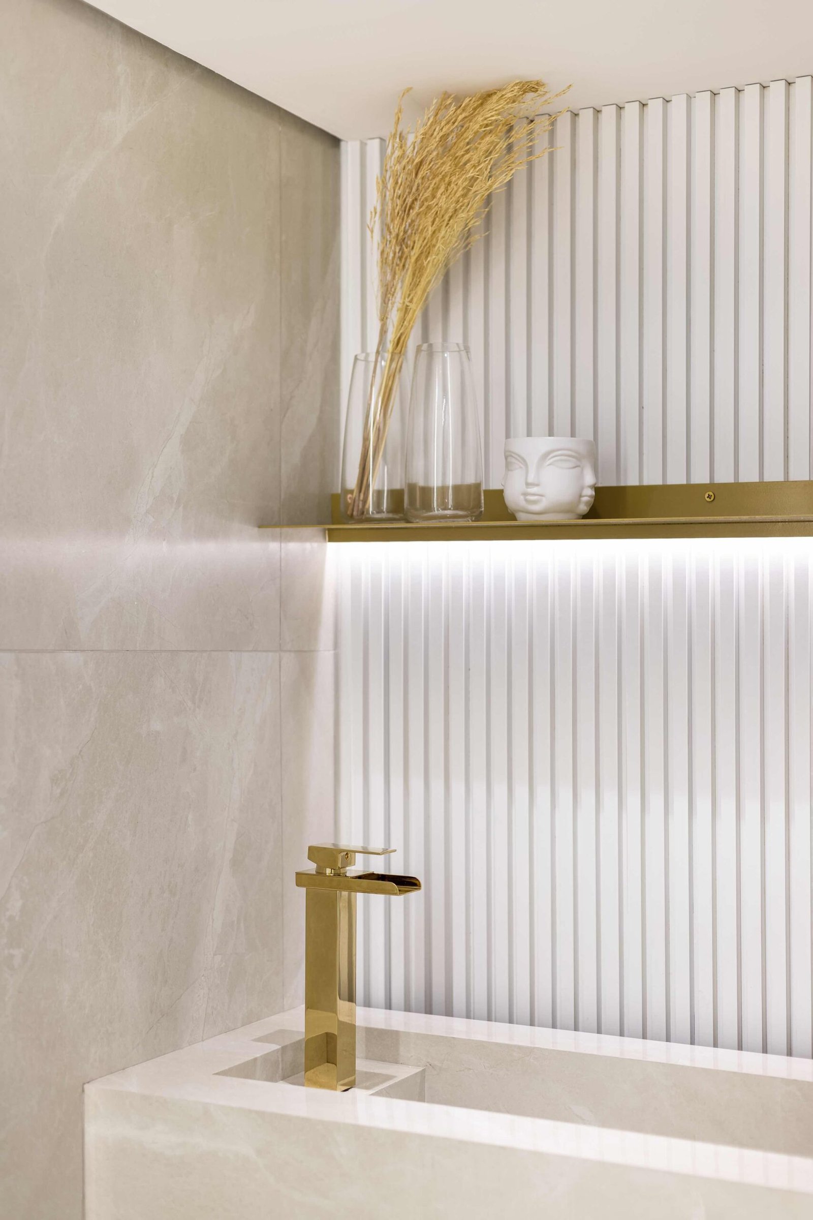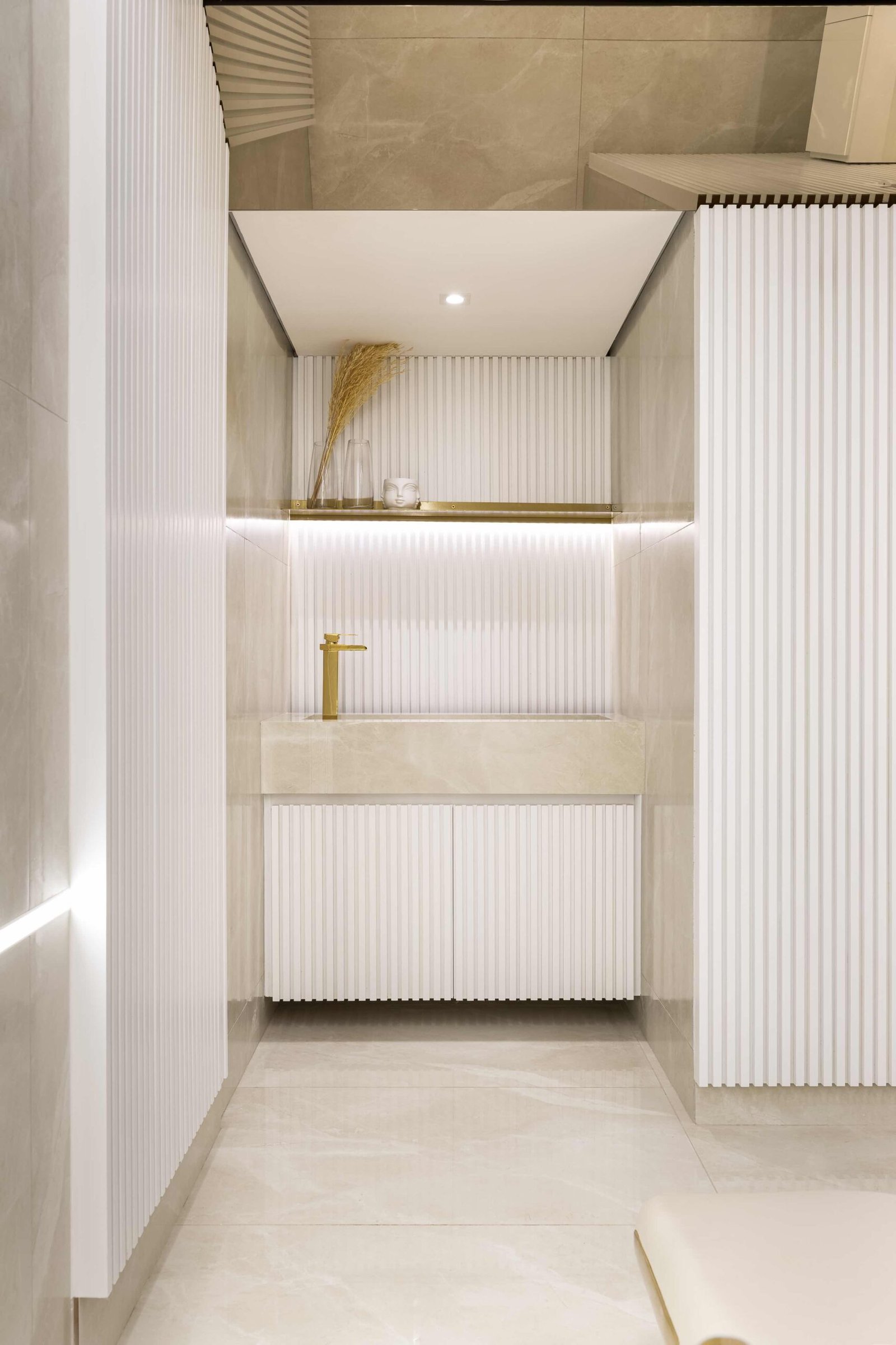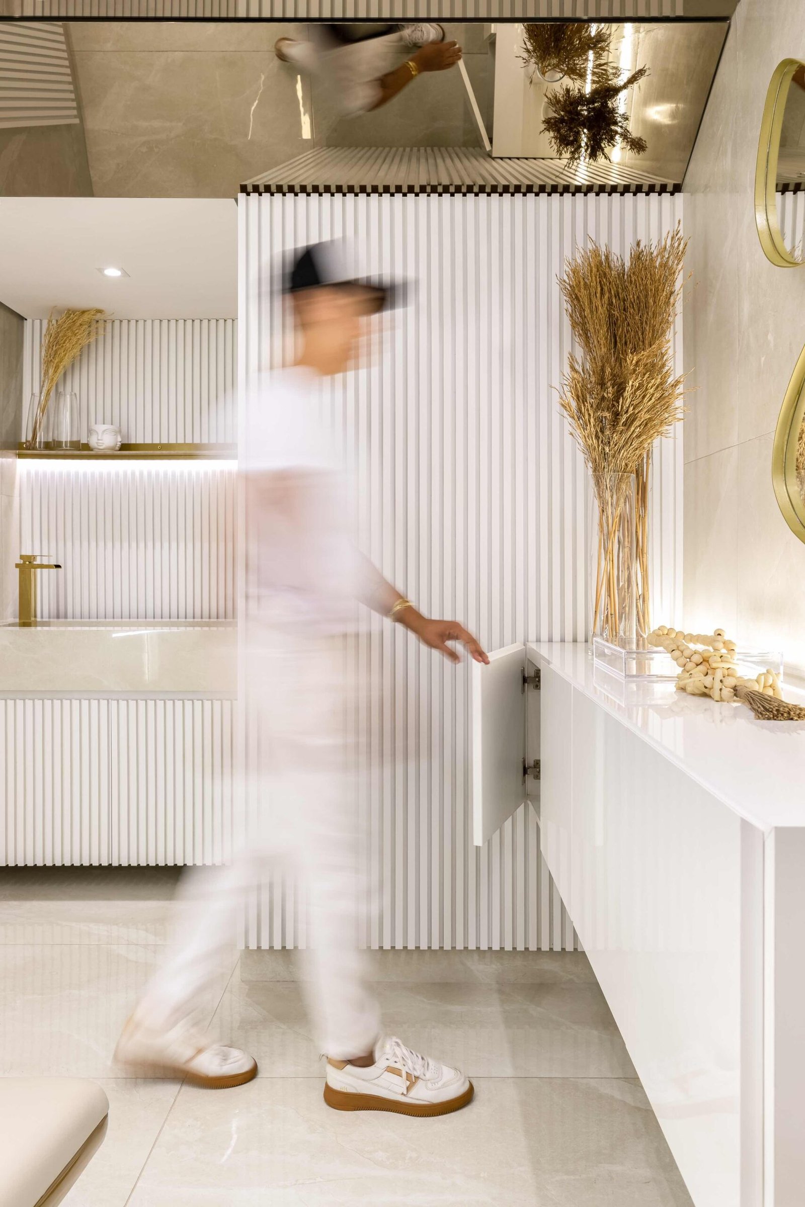 O projeto de interiores da Clínica de Estética FF foi pensado para criar um ambiente de relaxamento e sofisticação, ideal para promover o bem-estar dos clientes. Utilizando apenas duas cores bases, o branco e o dourado, o espaço reflete um equilíbrio perfeito entre serenidade e requinte. O branco, símbolo de pureza e tranquilidade, amplia os espaços e contribui para uma sensação de leveza.